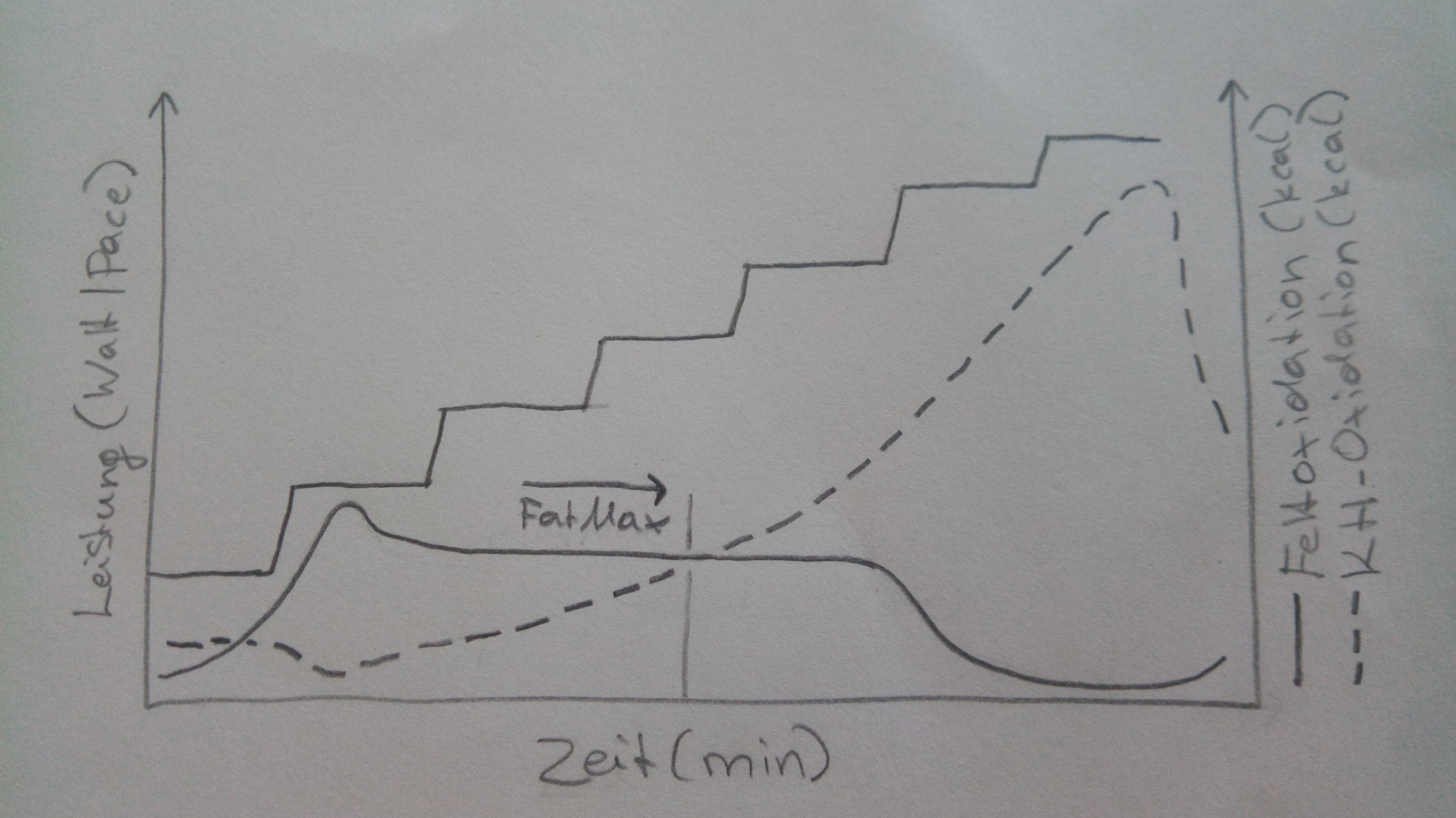 Genau genommen ist der ideale FatMax-Trainingsbereich auch nicht zwingend ident mit der absolut höchsten Fettverbrennung (die beim Stufentest oft ganz früh bei sehr niedriger Intensität als kleiner Peak auftritt). Ideal für einen Ausdauersportler ist ein längeres Plateau einer hohen Fettoxidationsrate wie in dieser Grafik ersichtlich.